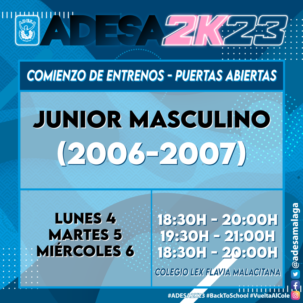 Llega Septiembre y llega la #VueltaAlCole. El primer equipo de #ADESA2K23 será el Junior Masculino. Los nacidos en ’06 y ’07 empiezan los días 4/5/6 de Septiembre.